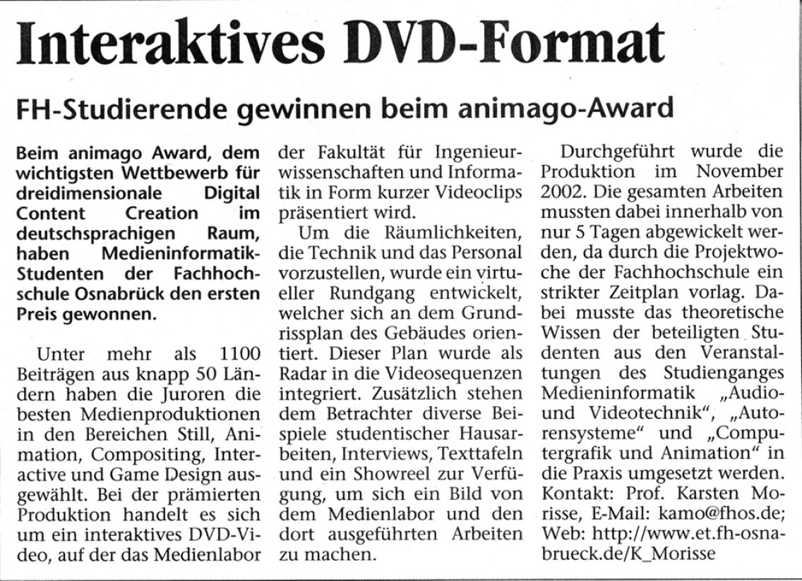 {2002-11-14} DVD "Medienlabor der FH Osnabrück" Status: Schon lange fertig ... (c: Original-Text von damals: "Bei diesem Projekt handelt es sich um eine Präsentation des Medienlabors der Fachhochschule Osnabrück. Als Medium wurde DVD-Video/DVD-ROM gewählt, um eine visuelle und interaktive Umsetzung zu gewährleisten. Die Produktion der DVD erfolgte im Rahmen einer einwöchigen Projektwoche im WS 2002/2003. Um die Räumlichkeiten, die Technik und das Personal vorzustellen, wurde ein virtueller Rundgang entwickelt, welcher sich an dem Grundrissplan des Gebäudes orientiert. Dieser Plan wurde als Radar in die Videosequenzen integriert. Zusätzlich stehen dem Betrachter noch diverse Beispielarbeiten, Interviews, Texttafeln und ein Showreel zur Verfügung, um sich ein Bild von dem Medienlabor zu machen. Des Weiteren enthält die DVD einen plattformübergreifenden ROM-Teil, welcher eine einfache Bildergalerie bereitstellt und quasi eine Art Making-Of repräsentiert. Bei diesem Projekt wurde auf selbstproduziertes Material, wie z.B. die Interviews und Vorlesungen, und auf studentische Hausarbeiten zurückgegriffen. Der Grob- und Feinschnitt, das Compositing, die Musikkomposition, das Authoring und das Proofing mussten innerhalb von 5 Tagen abgewickelt werden, da durch die Projektwoche der Fachhochschule ein strikter Zeitplan vorlag. Besonderheiten: Durch den engen Zeitrahmen war es erforderlich, dieses Projekt straff zu organisieren und eine gute Aufgabenverteilung durchzuführen. Auf Grund der Verzahnung der einzelnen Aufgaben konnte der Zeitplan nur durch gute Koordination eingehalten werden. Jedoch mussten auch Kompromisse eingegangen werden und viele weiterführende Ideen aus zeitlichen Gründen verworfen werden. Als größte Besonderheit ist die Konvergenz zu nennen, die dafür gesorgt hat, das theoretische Wissen der beteiligten Studenten aus den Veranstaltungen "Audio- und Videotechnik", "Autorensysteme" und "Computergrafik und Animation" in diesem Projekt in die Praxis umzusetzen." Die DVD hat beim animago-Award 2003 den 1. Platz in der Kategorie "DVD-Design" (Usergruppe: Education, Typ: Interactive) gewonnen. Dafür gab es sogar einen kleinen Bericht in der "Neuen Osnabrücker Zeitung" (10.05.2003). Enthalten sind: